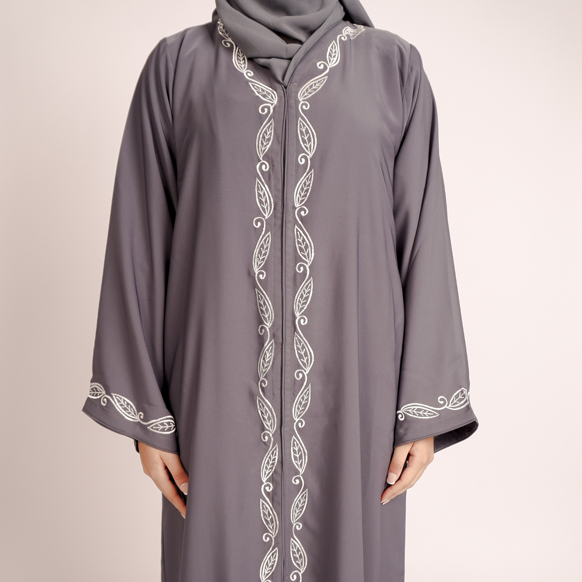 Stay stylish and modest with the Vine Abaya. Made from comfortable and high-quality Korean Nida, it features a unique vine and leaf print down the sleeves and front, accented with white stitching. Inspired by our heritage. The high neck and central button placement adds a touch of sophistication. Comes with a matching grey scarf/ hijaab.
